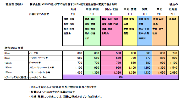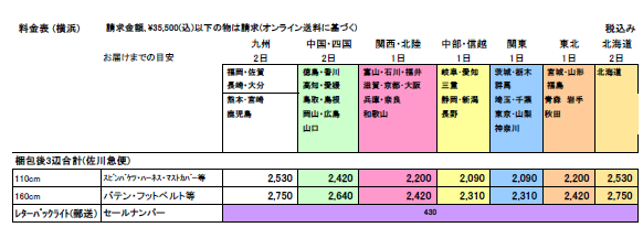 発送荷物が160サイズを超えるような場合や長尺、大型商品のご注文の場合は送料をお見積の上改めてご請求金額をご案内させて頂く場合がございますのでご了承ください。